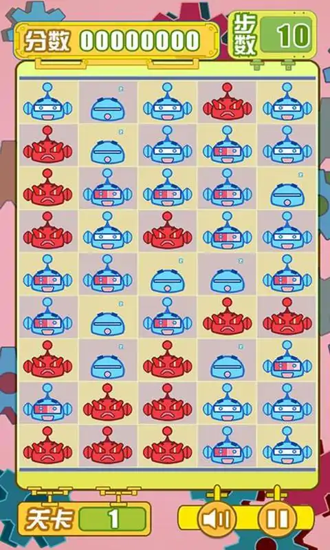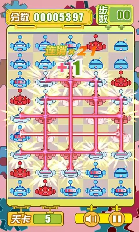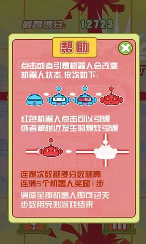 《别惹机器人》是一款非常易上手的微策略十字消除类游戏,游戏的规则简单:每关有固定步数限制,每个机器人有四个有序状态,每点击一次,消耗一次可用步数,被点击的机器人变到下一个有序状态,最后一个有序状态的机器人被点击后发生爆炸,会使其上下左右四个方向上的机器人分别进入下一个有序状态,如此反复,直到爆炸停止;单次引起的爆炸数量越多得分越高,达到一定连消步数还会有步数奖励,消灭掉本关所有机器人,即可进入下一关,步数用完游戏结束。简单轻松、粗暴任性的治愈系游戏别惹机器人。 游戏虽然简单,但想要玩出很高的分数还是要耗费不少脑细胞的,拿别惹机器人开动脑筋打发时间也是不错的选择。如果喜欢消除类的游戏的话,别惹机器人是一个不错的选择