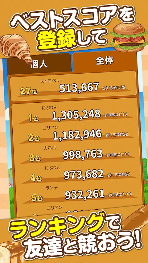 成为面包师并连接相同颜色的面包以擦除它们并瞄准高分! 一个独特的角色会根据你的分数来买面包! 【怎么玩】 - 连接3个或更多相同颜色的面包,让它们消失! ・连接越多,得分越高! ・如果抹掉很多面包,就会进入发烧时间!有机会上分! ? ・擦掉顾客想要的面包时获得奖励核心! 让我们在排名注册中争夺最高分