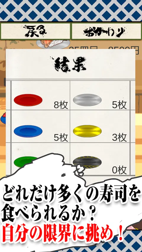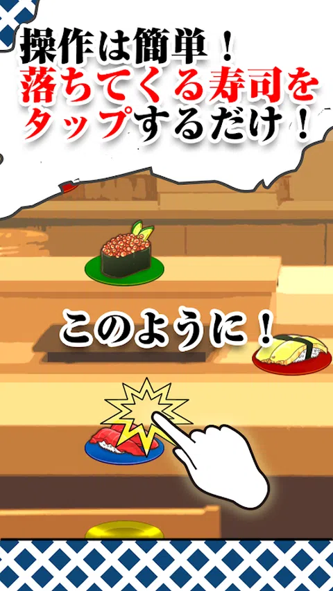 欢迎! 你能吃多少寿司,饮食文化的代表? 便于使用!点击游戏吃掉下的寿司! 即使你只吃过传送带寿司,你也可以在这里吃到吃到饱的高端寿司! 点击下落的寿司! 轻敲! 现在,你能吃多少寿司! ? ●操作说明● 点击从屏幕顶部掉下来的盘子上的所有寿司。 如果你留下一些东西或点击没有寿司的部分,游戏就结束了! 你能吃多少寿司? “挑战你的胃的极限!” ・普通游戏模式 这是一种争夺吃掉“盘子”数量的模式。 请注意,下降速度会随着时间的推移而增加。 ・暴食模式 一种争夺所吃盘子价格的模式。 更高的“金盘”和“银盘”价格更高! 如果您可以点击时间出来的“黑板”,您将进入“发烧模式”! “昂贵的盘子”会在一段时间内下跌! ·记录 记录在正常模式和暴食模式下拍摄的记录。 创下更高的记录并炫耀差异