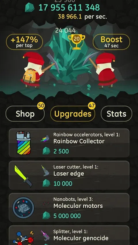 许多人认为侏儒(或他们自称的侏儒)只不过是一种愤怒的小害虫。 也许他们只是需要一些爱和理解?不!他们想要统治世界,他们需要矿石—数百万、数十亿颗钻石!这就是为什么我们为他们制作了这款愤怒的小点击游戏。 开始开采矿石并开发从石镐到反物质加速器、银河分裂器或时间悖论识别器的采矿技术!您将需要三样东西:战略、战术和大量的愤怒点击! 游戏特色: 使用 50 次可升级购买! 解锁超过 200 种史诗级升级! 在您最终获得钻石之前,学习开采 8 种不同类型的矿石! 加速您的点击:获得长时间会话的额外奖励! 激活 BOOST 让侏儒工作! 享受当侏儒的感觉:当其他人放弃点击时,侏儒才刚刚开始