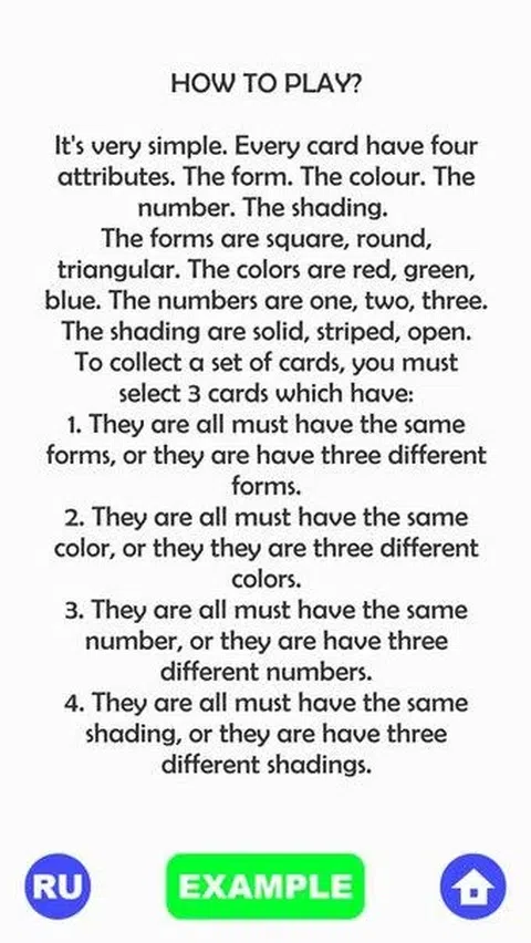 AMAZING SETS 是一款令人惊叹、色彩缤纷的卡牌益智游戏。由于设计简单,没有什么可以分散您创建套装的注意力。什么是SET? SET是游戏的主要目标。尝试创建由 3 张卡片组成的集合,这些卡片将根据四个特征相互连接: • 颜色 • 形式 • 填充 • 数量 您需要在给定时间内找到尽可能多的它们。 沉浸在魔法套装的世界中,以不同的模式自己创造它们,尝试打破你的记录
