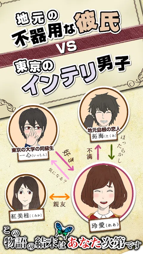 这个故事的结局由你决定。 【操作简单有趣的闲置恋爱游戏,适合打发时间】 应用深度学习免费!没有gacha(充电元素)!完全免费玩。 这是一款约会模拟游戏,您可以在其中点击在屏幕上摇摆的蝴蝶以推进故事。 你要去哪个故事? [推荐给这样的人