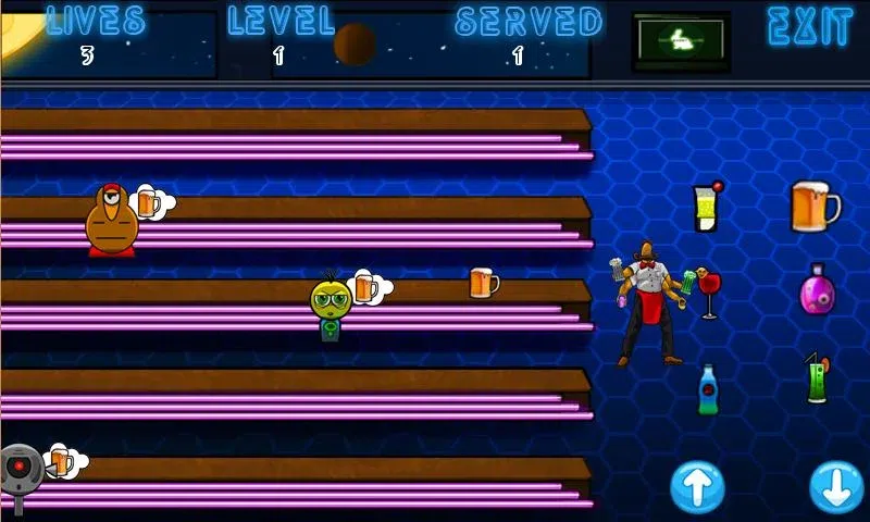 外星人渴了,给他们喝点水。当心,不要给他们错误的饮料,他们不喜欢它。只需触摸他们想要的饮料的图片。不要让他们走到桌子的尽头,不要送太多饮料。你只能犯3次错误!