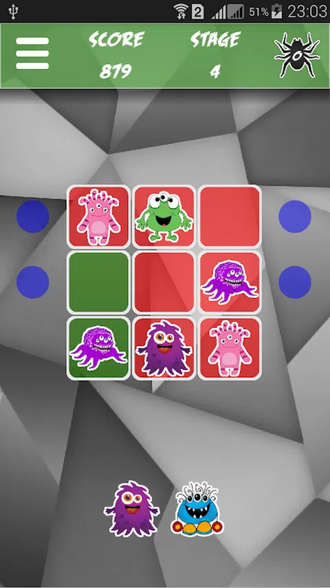 尽可能有策略地将怪物移动到场上,如果有两个或三个相互重叠,它们就会消失。这样,田野中的红色方块就消失了。通过一次清除多个块获得奖励积分。随着每个级别的达到,有更多不同的怪物,所以它变得越来越困难。保存蜘蛛,如果你被卡住,你可以用它作为通配符来摧毁它们。尝试上高分排名
