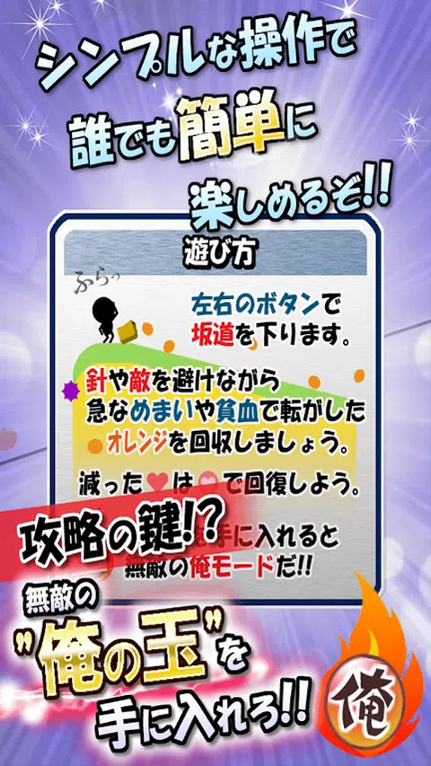 谨防突然头晕和贫血! 再现橘子在斜坡上滚动的电影般场景! 任何人都可以玩的权威火柴人简单动作游戏! 操作按钮,收集从斜坡上滚下来的橙子。 如果您击中敌人或刺中刺,则游戏结束。 让我们争夺收集的橙子的数量! - 配备我的模式! 当您获得“我的球”时,您将在一定时间内处于无敌模式! 这是战略的关键! ●瞄准!金奖杯! 获得一定分数的奖杯! 如果你得到一个灿烂的金子,就会出现隐藏模式!