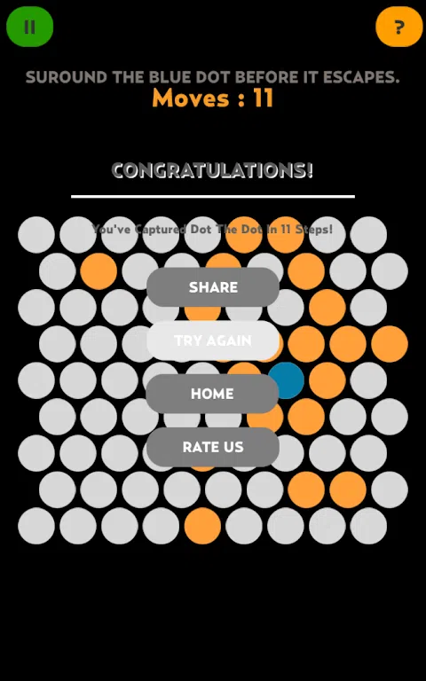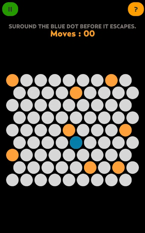 这是简单但令人上瘾的游戏! 规则很简单:只需将蓝点困在圆矩阵内。 只需将蓝点困在圆圈矩阵中。不过,这是一个聪明点。 只需点击灰点,它们就会变成橙色。蓝点被这些橙色点挡住了。 在蓝点逃脱之前用橙色点包围蓝点