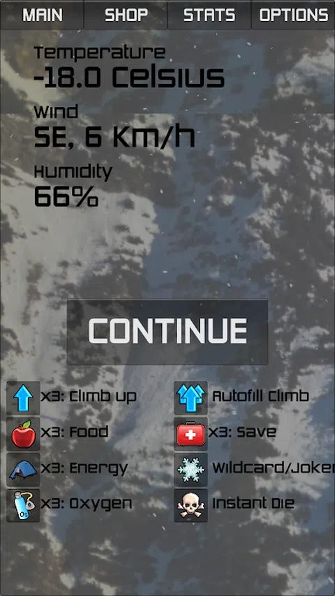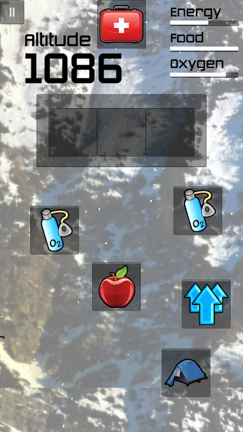 达到你能达到的最高高度! 匹配三个帐篷 - 这会增强你的能量。匹配三个苹果 - 这会增加你的食物。等等。不过要小心!氧气不断减少,能量随着每次点击而减少,食物随着每次休息而减少!再加上头骨时不时地出现在可用的收藏品中,并导致游戏结束。除非你没有可收藏的保存套件