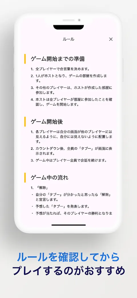 每个玩家都有一个“禁忌”,违反“禁忌”的人将被禁止参加游戏。 为了获胜,你有两个选择:消除“禁忌”或生存。 这是一款在NG文字游戏中添加了NG动作的游戏。 默认:执行卡上写的“禁忌”并被其他玩家指出。 或者“取消”失败。 胜利:成为最后之一或成功“释放”。 游戏开始后,请继续对话。 在游戏中取得良好进展的技巧 如果您在开始游戏之前决定谈话主题和开始对话的号码,您就可以在不停止对话的情况下享受游戏。 收到问题的玩家应该能够自由回答(如果对方试图让对方说一些禁忌的话,对话就分开了…) 您还可以通过添加各种规则来获得乐趣,例如一边玩一边做其他事情!