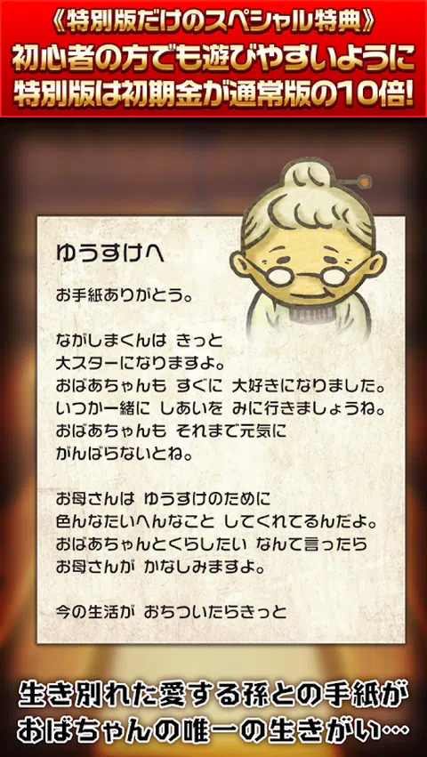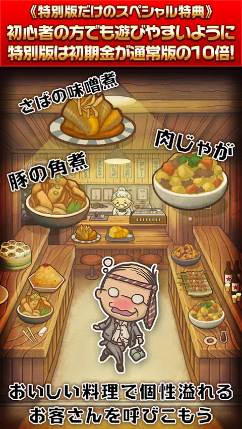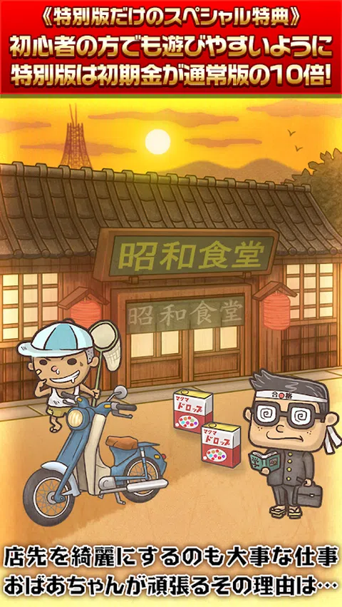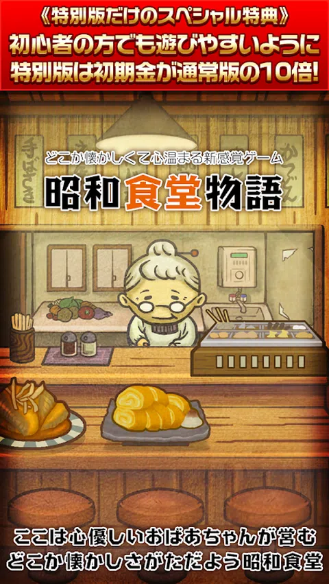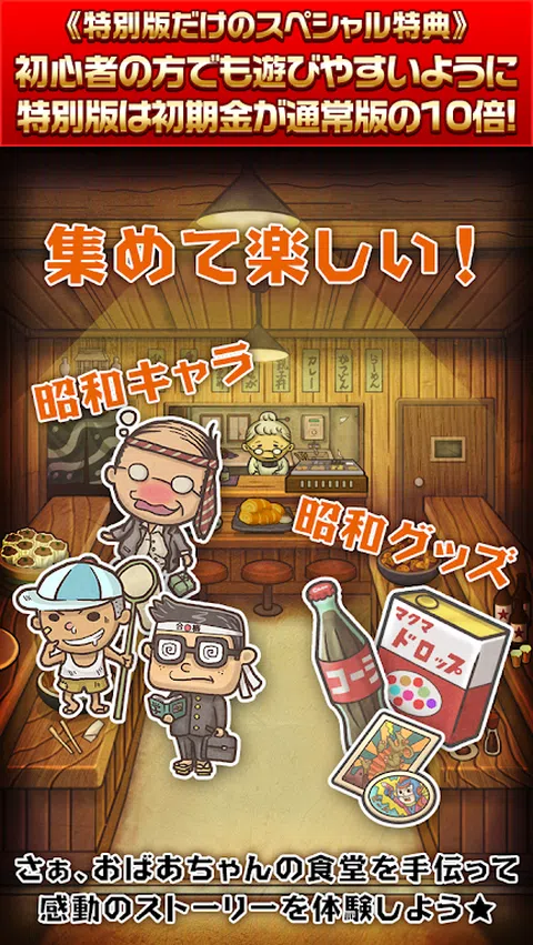 ★特别版外观★ 广受好评的昭和食堂物语特别版登场! 入手比普通版多 10 倍的钱! 即使是初学者也很容易玩,所以一定要趁这个机会下载它^ ★游戏说明★ 【一个温暖你心的新感觉游戏。 ] 让我们邀请顾客到奶奶开的自助餐厅,让店铺生意兴隆! 蓬松的甜玉子烧和蓬松的大学球。 一个头上系着领带的醉醺醺的上班族,一个勤劳的浪人。 有奖金的焦糖和一瓶可乐。 您可以尽情享受昭和时代的怀旧和略带悲伤的世界! 随着游戏的进行,祖母和孙子悠介的故事也在进行。 毫无疑问,奶奶看着佑介成长的温柔目光,一定会让你热泪盈眶! 对于那些厌倦人际关系、日常生活和社交的人 推进故事的感人游戏登场! 请在你忙碌的日子里得到医治^ ■ 故事 时间是 1953 年。一位善良的祖母经营着一家餐馆。 温和的调料抓住了人们的胃,变成了大家放松的地方。 祖母的人生目标是她的孙子优介。 幼时被母亲遗弃的悠助,由外祖母悉心抚养长大。 有一天,他的母亲突然来接佑介,他们分开了… 担心孙子孙女的祖母和想念昭和食堂的佑介之间 通讯开始了… ■ 3种享受方式 ◎让我们增强商店! 每天都有很多顾客光顾餐厅。 让我们用你赚的钱越来越多地增加食堂的菜单。 ◎ 完成绘本吧! beigoma、罐头滴剂、一般小孩等“昭和时代”满满! 收集怀旧的昭和商品和昭和人物来完成您的图画书。 ◎ 来看看故事吧! 奶奶和孙子佑介之间交换的信件,一定要哭了!让我们看看故事是如何发展的。 ■操作简单! 1.如果你刷进店的顾客,他们会付钱给你。 2.保持店面清洁也是一项重要工作。通过滑动收集掉落的昭和商品并获得金钱。 3.用你省下来的钱,可以增加食堂的菜单。 4.如果你增加菜单,你会听到声誉,新客户会来! 5. 当您重复步骤 1-4 时,故事会继续进行。不要错过动人的结局