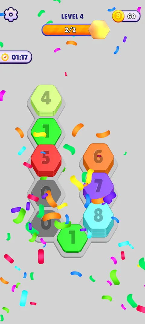 规则: - 滑动六边形以连接它们 - 总和应为 10 - 达到目标 - 清除所有关卡 - 享受!