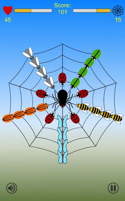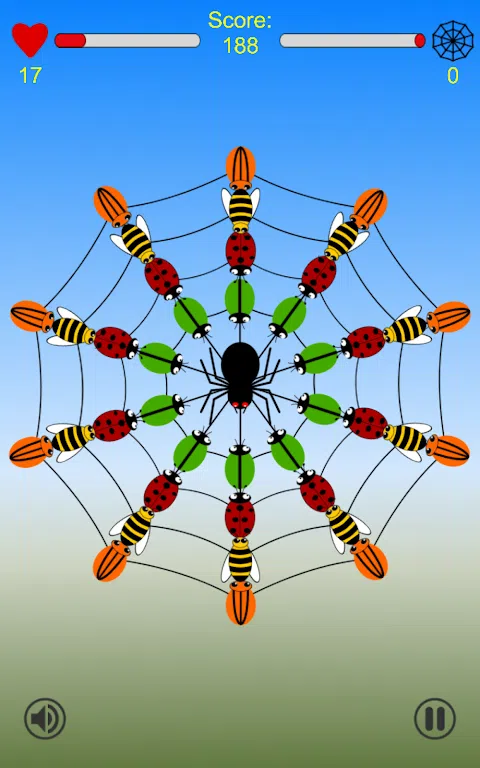 Zippy Spider - 策略非常重要的三消游戏。 昆虫不断来到蜘蛛网上,蜘蛛越来越饿了。通过交换昆虫来形成昆虫群,帮助蜘蛛吃掉昆虫。一旦创建了 3 只或更多昆虫的群体,蜘蛛就可以吃掉这些昆虫,您就可以得分。但要小心—每次交换,都会有更多的昆虫到达,蜘蛛网会慢慢填满。 蜘蛛吃的昆虫群越大,你得分就越高。将昆虫分组为环可获得最高分,但您需要一个好的策略来创建昆虫环