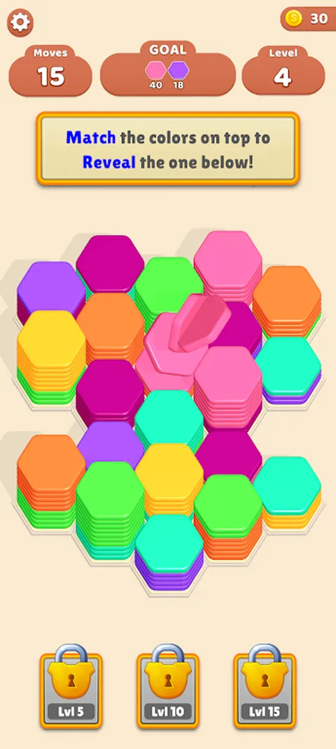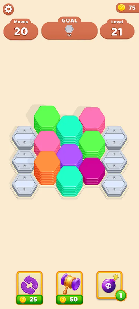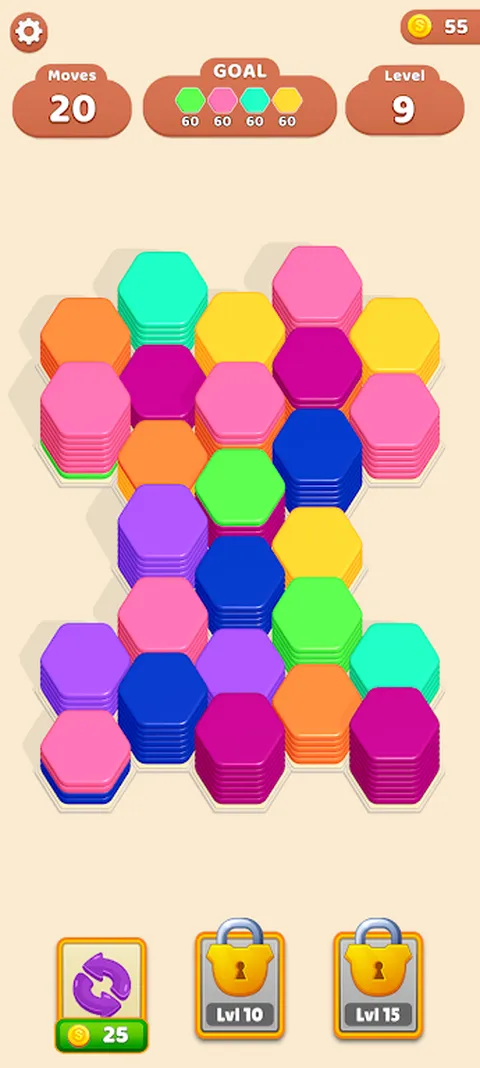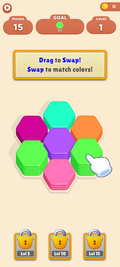 规则: - 滑动以交换六角形 - 相邻的六角形将自行排序 - 堆叠 10 个六角形以收集它们 - 清除所有关卡 - 享受!