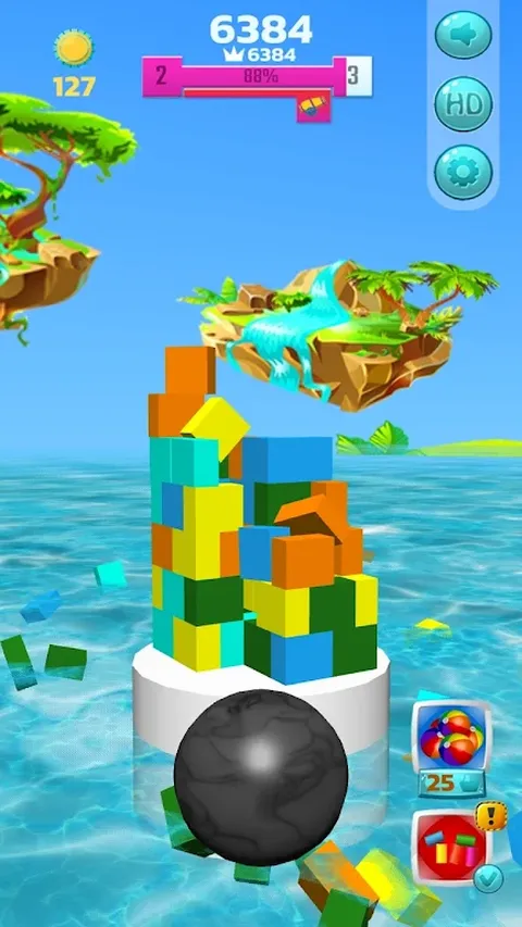 这是一个关于摧毁积木塔的游戏。 玩家从积木塔中向相同颜色的积木发射弹珠,导致整个塔失去平衡或倒塌。每次射击都需要造成更大的崩塌,炸开的积木越多得分越高。 过关前会有巨球奖励。如果你表现得好,你可以将积木塔压平到地面。