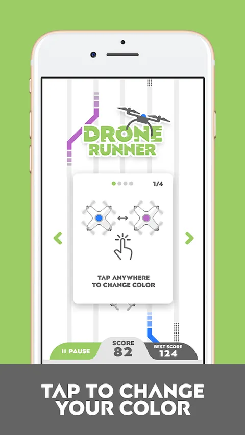 Drone Runner 是游戏开发专家 Reten Games 推出的最新热门游戏,是一款具有独特之处的无限跑酷游戏:无需滑动,无需拖动,只需点击。就是这样!当你失控的无人机沿着充满危险的道路倾斜时,你所需要做的就是点击改变它的颜色以避免危险! 不过,不要担心,因为有与您平行的路径,并且有通向它们的连接:只需匹配颜色即可!在蓝色的时候触摸一条蓝色的路径,你就会穿越它!同样,在你自己摇动紫色的同时触摸紫色的敌人,你将无害地穿过它,就像两艘船在夜色中驶过一样!一定要避开那些点状、破损的路径,否则你闪亮的新无人机会像闪亮的新兴登堡一样坠毁并燃烧。你的反应能力会带你走多远?你的手艺能经得起时间的考验吗?您有能力踏上胜利之路吗?立即下载《Drone Runner》即可找到答案!