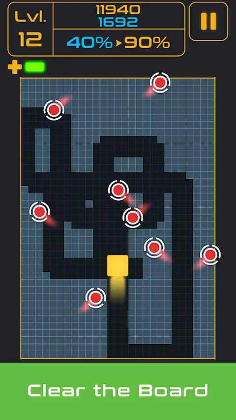 目标很简单:清除棋盘并保持活力。滑动即可上下左右移动方块。当您越过填充的方块时,它们就会被清除,您将获得积分。但不要撞上太空飞船,否则游戏就结束了。清除屏幕顶部写的棋盘百分比,您将进入下一个级别。