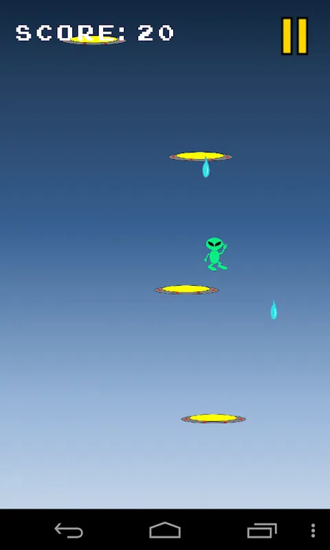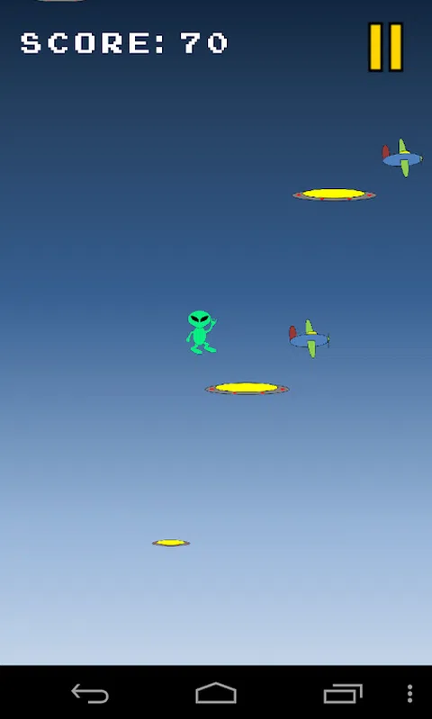 Alien Jumper:Android 上最伟大的外星人主题游戏之一。在这个令人上瘾的外星人游戏中,将外星人带到他的母舰 UFO 并收集尽可能多的水。 在这个外星人 UFO 游戏中,你需要帮助外星人跳上不同的 UFO,这样他就可以一路跳到外星母舰 UFO。倾斜你的手机左右移动外星人。有些不明飞行物是静止的,有些是移动的,所以要注意。哦,是的,有些不明飞行物会在你跳上它们后消失! 飞机会将外星人从天空中击落,所以你要避开那些。一些 UFO 宇宙飞船有外星传送门,可以让你飞得很高—击中那些传送门,但一定要沿途收集水滴,因为这就是你得分的方式。 你能达到1000分吗? 该游戏以 Super Jumper 为蓝本,这是一款超级棒的跳跃游戏