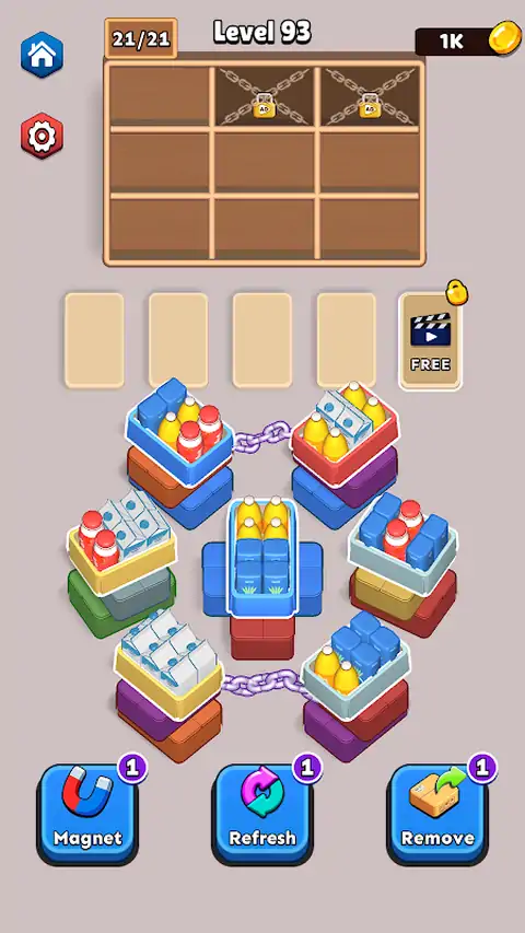 点击将盒子移动到插槽,将不同颜色的商品移动到架子上。 将相同颜色的物品与盒子匹配。