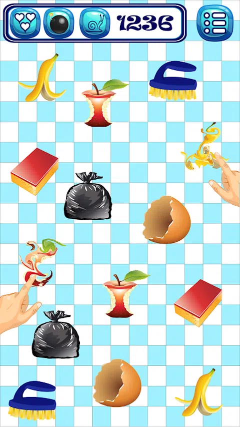还有到处是垃圾,它闻起来如此糟糕。蛋壳,垃圾袋,香蕉皮,吃苹果.尽快粉碎他们。但不要碰画笔和海绵。我们的目标是摆脱垃圾,而不是清洁用品。您将有功率UPS像炸弹和减速按钮。您可以使用它们各三次。而从时间的时候,你会发现一个点的助推器,别忘了挑选了