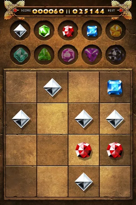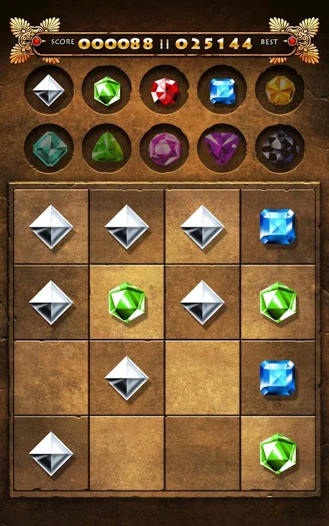 配对宝石,将一颗宝石滑到另一颗宝石上,形成一种新的宝石。两个银色的会产生一个绿色,两个绿色的会产生一个红色,依此类推。此订单显示在屏幕顶部。尝试获得最珍贵的一颗 - 黑色宝石。祝你好运