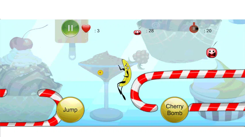 这是一款冒险游戏,关于香蕉竞速关卡,以在落下的樱桃朋友与糖果手杖地面相撞之前拯救他们,并提醒邪恶的樱桃,他们将试图阻止他完成任务