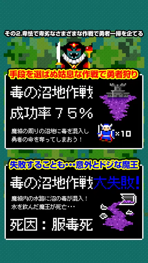 说到魔王,站在王座上迎接经过长途训练的英雄是标准,但出现在这里的魔王是・ ①使用英雄探测器,在他变强之前猎杀一个低等级的英雄→但是,如果英雄因过度忽视而达到99级,将确认死亡,他将沉睡1000年(重新开始) 2.在宝箱中设置陷阱,攻击第一座城堡,并尝试用各种姑息策略消灭英雄→但如果策略失败,则确认死亡并沉睡1000年(重启) 就算要重启,也会继承一些能力,增加策略的成功率,所以可以用所谓的“强新游戏”重启。