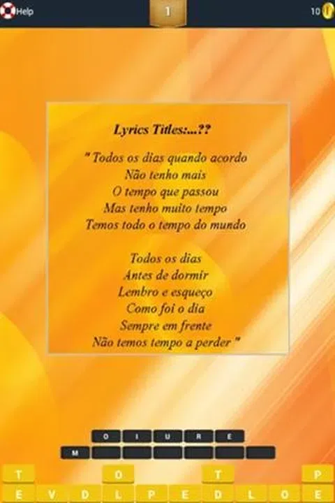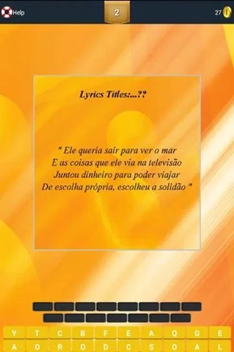 怎么玩: Guess 歌词:Legiao Urbana 您只需在字母栏下打出可用的字母即可。如果你正确回答了任何问题并且你得到了一个值,等等
