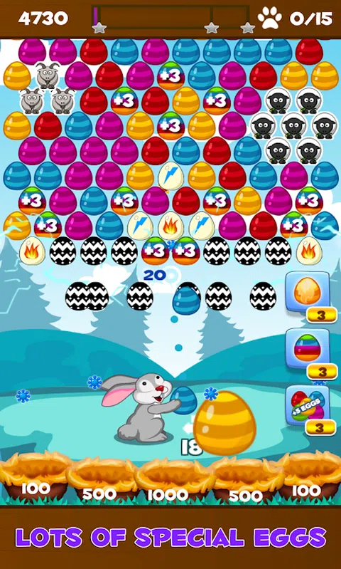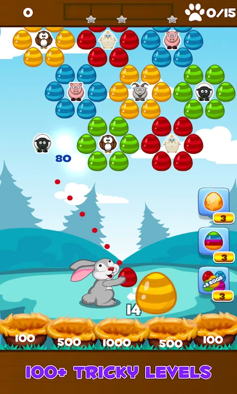 用复活节兔子瞄准并射击鸡蛋。三个或更多相同颜色的蛋连在一起就会自动消除。游戏的目标是获得尽可能高的分数,使用有限数量的鸡蛋收集每关的所有星星。游戏提供强大的奖励鸡蛋,例如燃烧蛋或闪电蛋,让游戏更加有趣。连续命中获得连击,并召唤瓢虫。有了这些瓢虫,当鸡蛋落在草地上5个巢当中的某个巢,就会弹起来,让你获得更多分数。游戏具有三种独特的游戏模式:清除顶部、解救小鸡和拯救动物。这个休闲益智游戏拥有100多关,极具挑战性,乐趣无穷。Bubble Bunny Blitz老少皆宜