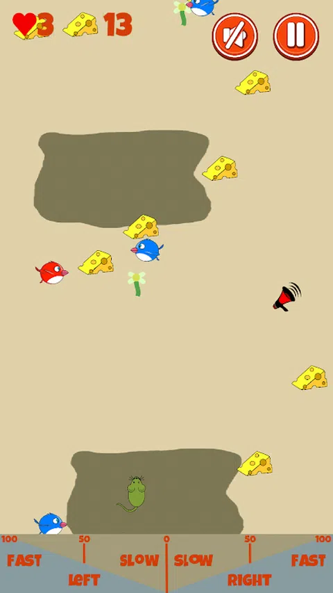 帮助老鼠收集奶酪,但别忘了观察小鸟。他们也饿了,很想抓老鼠。还要注意粘稠的泥浆,它会减慢你的速度。 通过左右移动鼠标来玩。您可以通过触摸靠近中间慢速或靠近边缘快速来控制侧向速度。最好将手指放在屏幕上并滑动以控制鼠标的速度和方向。 为了帮助您,请留意: • 发臭的绿色奶酪- 这会让你的老鼠也变成绿色,而鸟儿不想抓住绿色的老鼠。但要小心,效果会在 10 秒后消失。 • 鸣叫器 - 这会发出响亮的鸣叫声并吓跑所有的鸟儿 • 心- 这些会给你更多的生命 一开始,你有 3 条命,每次有一只鸟抓住老鼠,你就会失去一条生命,所以要留意那些鸟,不要让它们抓住老鼠。 记住要生存并获得大量奶酪,您需要获得绿色奶酪或奶酪,所以不要错过任何
