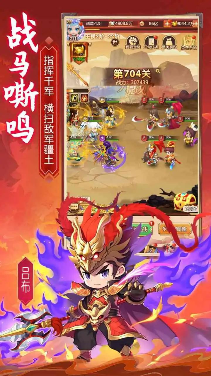 体验放置卡牌游戏的魅力与激情! 2024年全新3DQ版三国卡牌放置游戏《全民三国大战》萌力来袭!招募名将、培养兵种、配备阵容,丰厚的福利和优质的游戏体验,零氪也能成统一天下!主公,不妨来一探究竟,体验放置卡牌游戏的魅力与激情! 【自选千抽,开局V6】 上线送千抽,开局就VIP6!升级获得1000抽自选武将,一次抽个爽,轻松搭建满配阵容,享受多流派策略智斗的乐趣! 【击鼓招将,属性暴涨】 敲鼓招募萌卡武将,轻松获得心仪萌将!创新敲鼓招将玩法,挂机敲鼓,自动换将,升官发财,属性暴涨! 【特色玩法,放置减负】 零氪挂机不掉队,散人轻松好上位!轻松放置,自动战斗,随玩随停!武将配阵千变万化,小R逆袭绝不夸大! 【海量特色,众多玩法】 群雄逐鹿,平定中原,玩法丰富,战区争霸、跨服竞技,畅玩不停!兵符、兵法,技能随意搭,三国纵横笑哈哈!