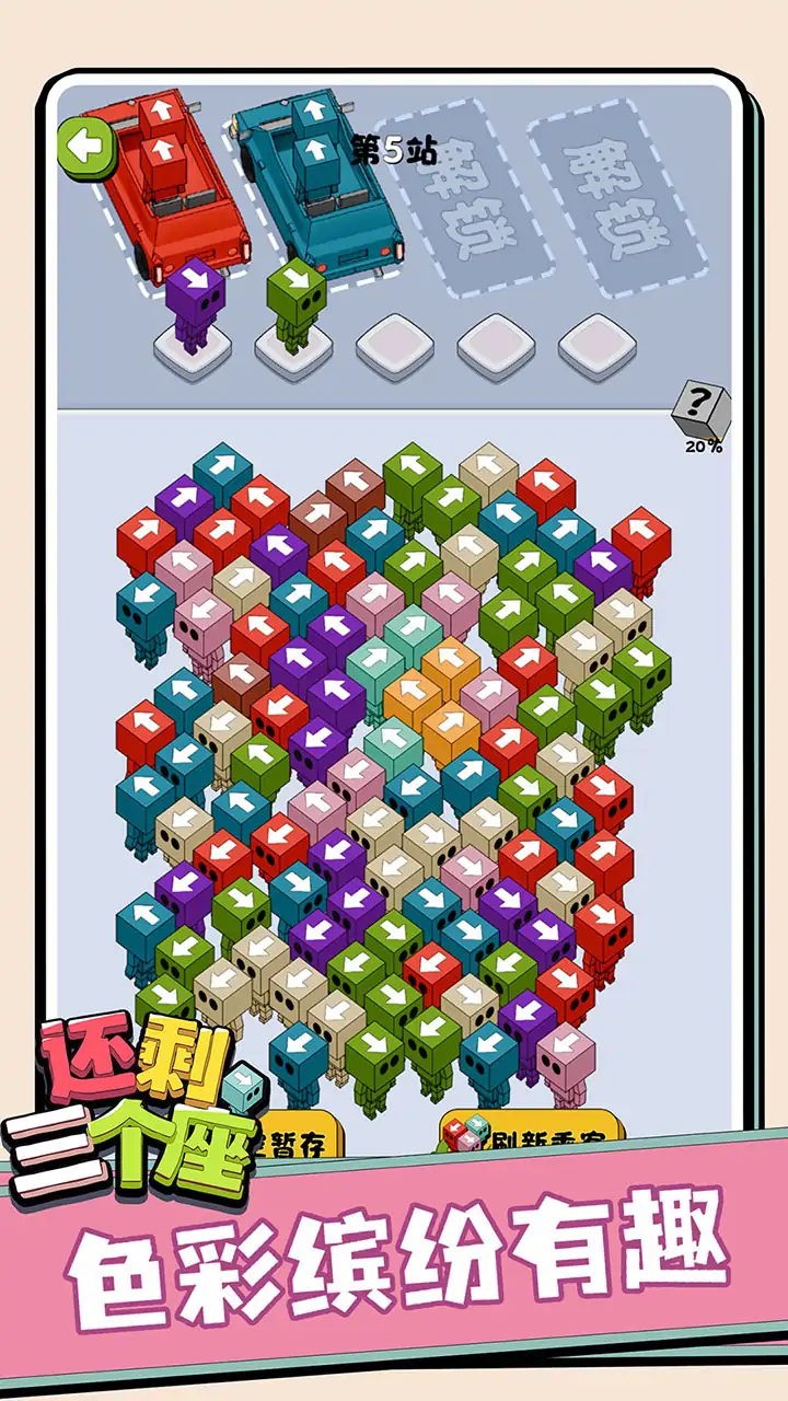 这是一款让乘客顺利乘坐上汽车的益智游戏,游戏方法为根据汽车的颜色点击对应的乘客,每名乘客都有箭头方向,只能向箭头方向移动,让他们都顺利的坐上想坐的汽车,游戏休闲有趣快来挑战一下吧。