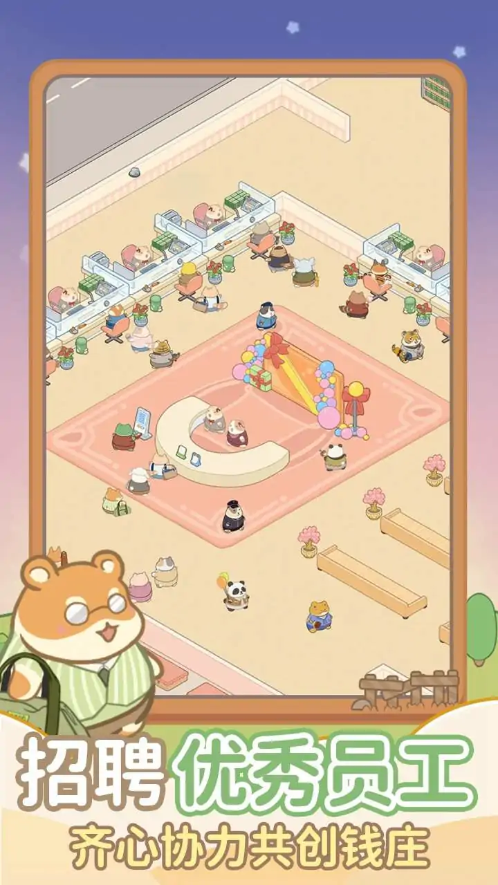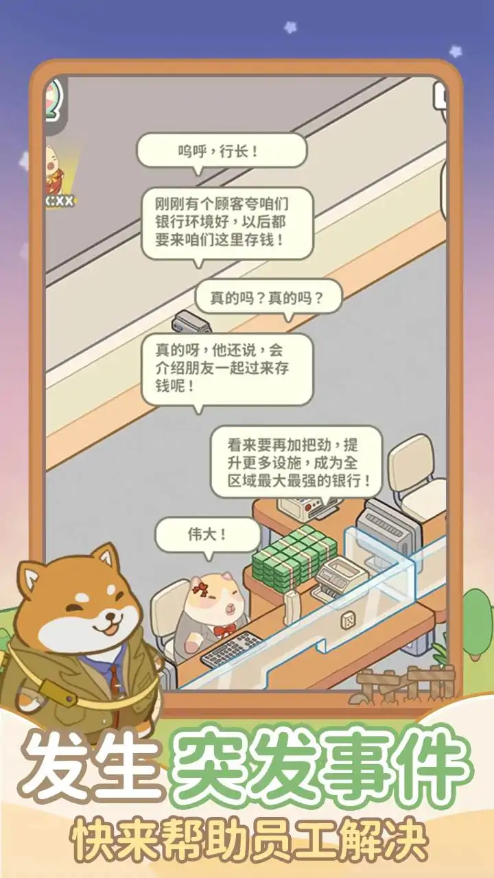 你从学校毕业后就进入动物城最大的动物钱庄工作,伴随着动物城经济迅速发展,对金融业务的需求急剧增加,总部决定新开一家钱庄。因为你过往的优异表现,总部决定派你去管理这家新开的动物钱庄。 身为动物钱庄的管理者,你需要 1.升级建设钱庄,通过提升钱庄设施,吸引更多的顾客前来 2.招聘优秀员工,给顾客带来更好的体验 3.挑战其他钱庄,让顾客自己进行投票,选出他们心目中的优秀钱庄。击败所有钱庄,称霸动物城 4.决定钱庄发展方向,是给顾客提供个性服务还是提升钱庄数字技术,哪个更重要呢? 5.解决突发事件,员工有时会遇到工作上的问题,需要你来帮助解决 6.颁发员工奖状,给优秀员工颁发奖状,提高员工对工作的积极性 7.举办顾客出行活动,对于钱庄来说,用户粘性可是很重要的,组织顾客参与美食派对和旅行活动,能让他们更加信赖你的钱庄,在钱庄里存更多的钱 8.吸引新顾客,通过击败其他的钱庄能获得礼品奖励,把这些礼品摆放在钱庄外部,能吸引来更多的路过的行人进入钱庄存钱 加油,将钱庄做大做强,成为动物城排行第一的钱庄!