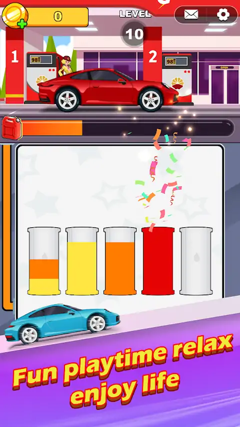 欢迎来到充满挑战和乐趣的汽车游戏世界! 游戏概述 尝试对瓶子中的有色水进行分类,直到所有颜色都在正确的容器中。一个要求很高但又放松的游戏,锻炼你的大脑!不仅如此,每次成功完成水分类时,都可以为加油站的储罐添加燃料。然后,角色将为汽车加油,这些汽车将驶入赛道并参加惊心动魄的比赛。继续给汽车加油,让它们继续比赛,看着它们在赛道上飞驰! 怎么玩? 基本玩法: 点击任意一个瓶子,将液体倒入另一个瓶子中。 只有到相同颜色的水彩画,并且目标瓶子中有足够的空间,您才能倒出水彩画。 尽量不要卡住 - 如果卡住了,您可以使用道具来帮助您或重新启动关卡。 创新玩法: 每当您成功完成一个装满水的瓶子时,它就会为加油站的储罐添加燃料。 随着燃料的增加,角色将为汽车加油,然后前往赛道参加自动比赛。 继续为汽车加油,以确保它们留在赛道上并完成尽可能多的圈数。他们完成的圈数越多,您获得的奖励就越多! 游戏特色 操作简单:单指操作,轻松上手。 无限关卡:挑战自我,不断升级。 免费游戏:完全免费,不涉及任何费用。 按自己的节奏玩:没有时间限制,自由地享受游戏。 赛车刺激:观看加满油的汽车在赛道上竞速,争取最高圈数! 为什么选择这个游戏? 这款水分类游戏不仅容易上手,而且充满乐趣和挑战。通过将颜色分类与赛车的刺激相结合,它提供了完美的放松和娱乐体验。 立即下载,开始你的分类、加油和竞速之旅!