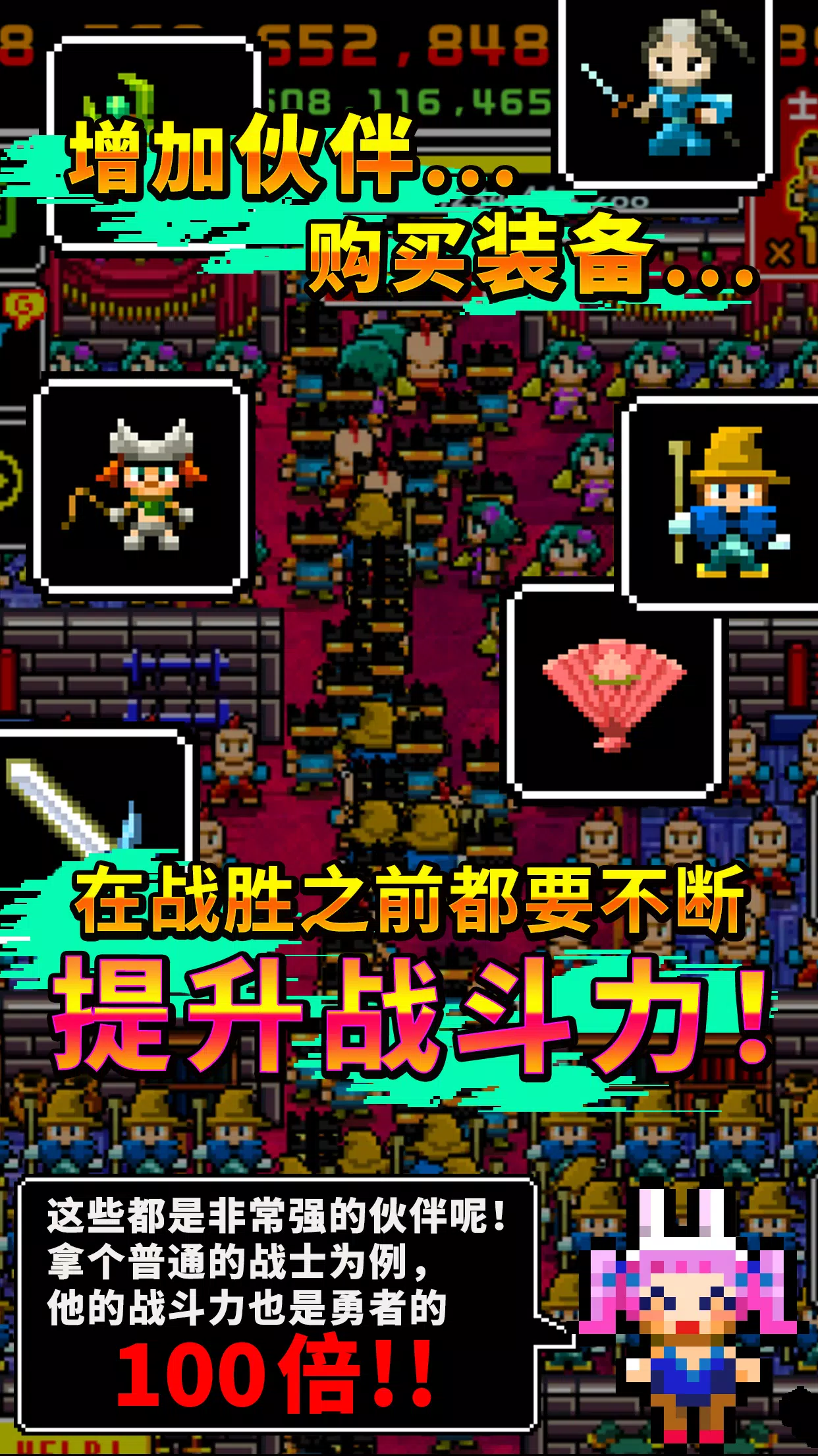 放置并停止Bunny叛乱! ■故事 去年,「魔王暗黑君主」席卷重创全世界, 大量的勇者牺牲,最终换来珍贵的和平, (详情请参考并试玩前作游戏) 整个世界都充满了久违的愉悦安宁! 讨伐击败魔王暗黑君主之后, 痴迷俊美帅哥的Bunny秘密进行叛乱行动。 她关闭旧魔王城,积存暗黑力量, 图谋将暗黑君主复活・・・ ================================ ■游戏特色 ・派出勇者门与拥有暗黑力量的魔物交战! 即使1人无法取胜,10人100人...一兆人就可以取胜! ・击败魔物,在魔王城建立基地! 建立基地以招募新同伴。压制魔王城! ‧大型古代魔法「精灵召唤」!还有传说中的巴哈姆特! 轻触神父储集魔力,召唤精灵!施放出强力的一击! ・控制同伴并利用战斗优势! 如果您指挥战场,就会激发英雄们的士气!大大提高攻击力! ・在赌场获得精灵! 转动地下赌场的轮盘,获得最强大的精灵「奥丁」!