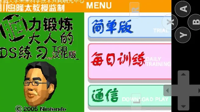 《东北大学未来科学技术共同研究中心川岛隆太教授监修 大人的DS脑力锻炼》是由任天堂公司开发的NDS平台益智类游戏,由东北大学未来科学技术共同研究中心川岛隆太教授监制,2005年5月19日于日本首发。该作基于川岛隆太关于“每天10-20分钟阅读、写作、计算等练习可激活前额叶皮质活性,改善记忆、判断、思考能力”的医学理念设计,属于PZG(益智/迷你游戏集合/教育)类型。 游戏包含猜拳、算数、数箱子、记忆照片等训练项目,运用文字辨识、语音辨识技术实现操作交互。玩家可通过脑年龄测试评估认知能力,并以每日短时训练更新测试结果。核心玩法涵盖猜拳、数箱子、记忆照片等迷你游戏,支持双人模式。
