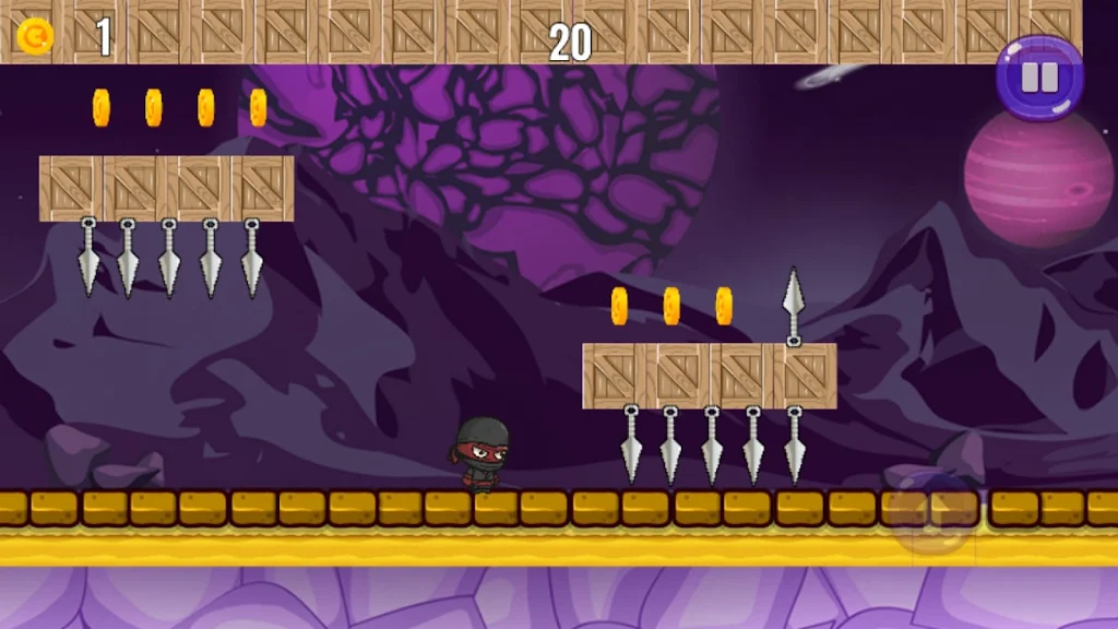 黑忍者自动向前奔跑,探索一片充满危险的黑暗阴森森林。点击屏幕右侧的向上箭头跳跃并躲避沿途的障碍物。巨大的手里剑向他飞来,同时,带刺的栅栏和隐藏的陷阱也在等待着他。如果他击中任何一个,游戏就会重新开始。收集尽可能多的金币来获得高分并解锁新的忍者。