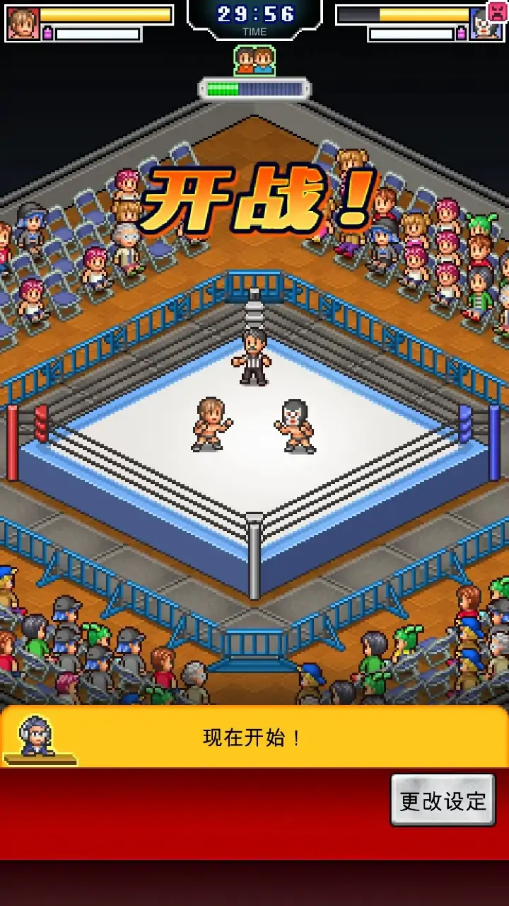 打造拥有最强摔角手的职业摔角团体!! 全新的职业摔角团体已创立。职业摔角手最注重日常饮食与训练。 在训练场放置卧推器等训练器具,用来锻炼肌肉力量。 不断强身健体,抗衡对手! 其他团体的选手正在等待你的挑战!!做好万全准备,开启挑战吧。 在赛前采访中挑衅、迷惑对手…… 接招再接招,忍住伤痛站起来!这就是职业摔角手的魅力。 比赛中战况激烈,全场沸腾。 使出终结技,倒数三个数结束比赛。 团体人气不断提高,粉丝们也会来训练场参观学习。 不断增加训练场设备,制作销售产品,快乐如此简单。 不断增加己方选手也非常重要。游说兼具实力与魅力的强大选手来加入吧。 还可参加车轮战、6人车轮战。 来吧,推动职业摔角行业发展,打造人气职业摔角团体!!
