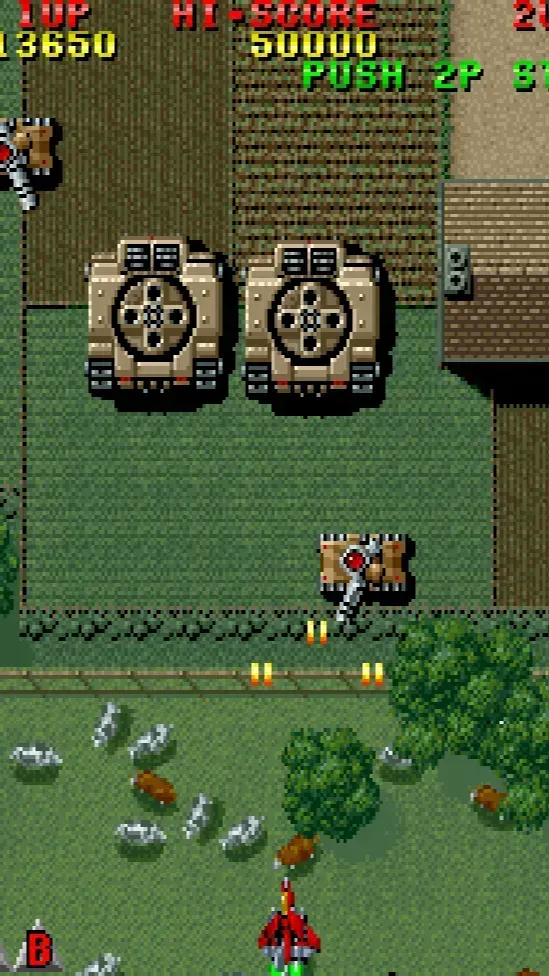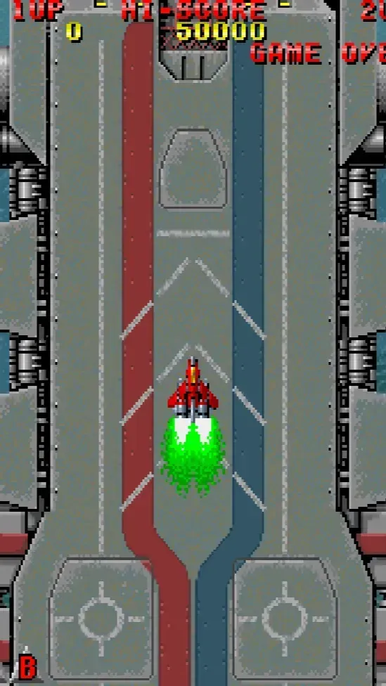 1990 年 Seibu 开发的纵向卷轴射击经典,背景设定在 2090 年地球对抗外星入侵,玩家驾驶 “雷电 MK - II” 战机反击。全球销量达 17000 台,以有限硬件成就 STG 标杆。本游戏为世界版。 版本特色 核心为动态武器系统:主武器火神炮(红)与激光(蓝)通过变色道具 8 级升级,同色强化、异色切换;副武器 M 弹(黄)与 H 弹(绿)4 级强化,平衡范围与追踪。炸弹最多携带 7 个,延迟引爆可清屏消弹,双人协作时子弹散射威力提升。 操作方法 8 方向摇杆控制移动,A 键射击,B 键放炸弹(X/Y/L/R 无对应功能)。近距离火神炮全中伤害惊人,激光适合精准打击,善用道具切换武器应对不同战局。