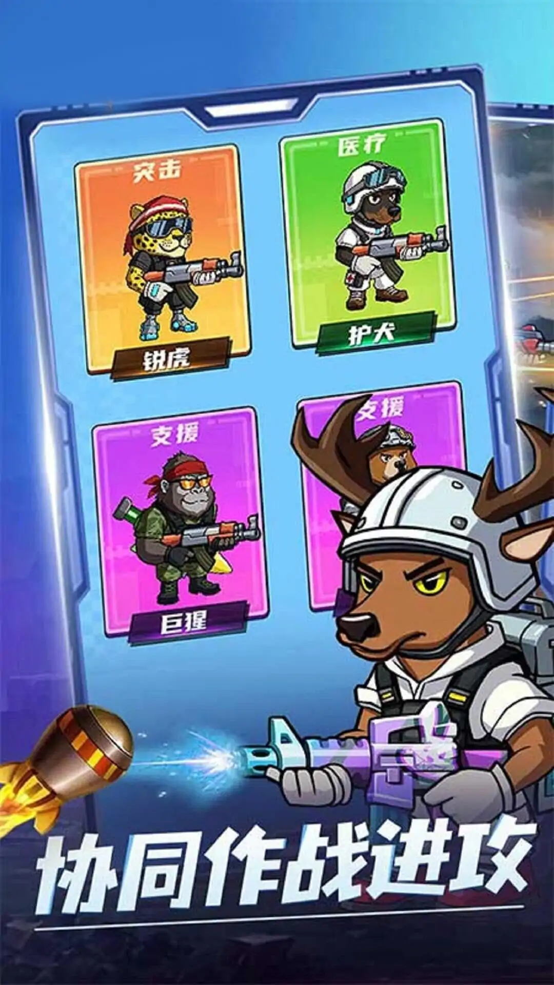 这是款现代军事风 2D 射击手游,主打双人组队战术协作。左摇杆移动配合右屏瞄准,滑铲翻滚规避火力,更有狙击手远程压制与突击手近战突破的职业搭配。