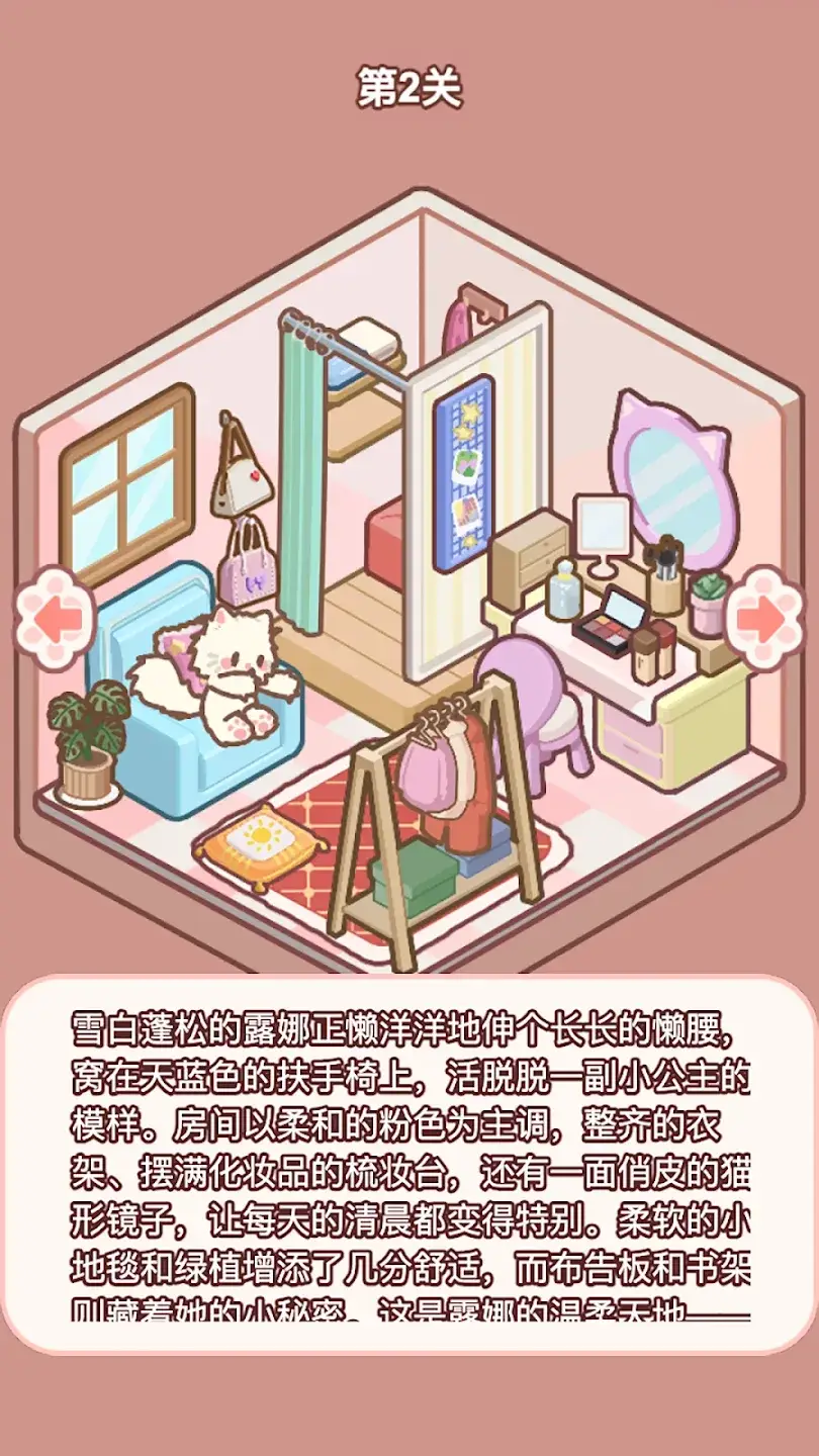 欢迎来到这款温馨舒适的猫咪家居装饰游戏! 你的任务简单却又充满惊喜——把每一件家具和每只可爱的猫咪都摆放到合适的位置,完成房间的布置! 每一关都会带你进入一个全新的空间,从舒适的卧室到时尚的客厅——一切都等待着你来点缀。 保持敏锐的思维,快速将每件物品摆放到位,看着每个温馨的猫咪之家焕然一新! 这款游戏可爱、巧妙,而且充满满足感——对于所有喜欢猫咪和温馨氛围的人来说,挑战与放松的完美结合。