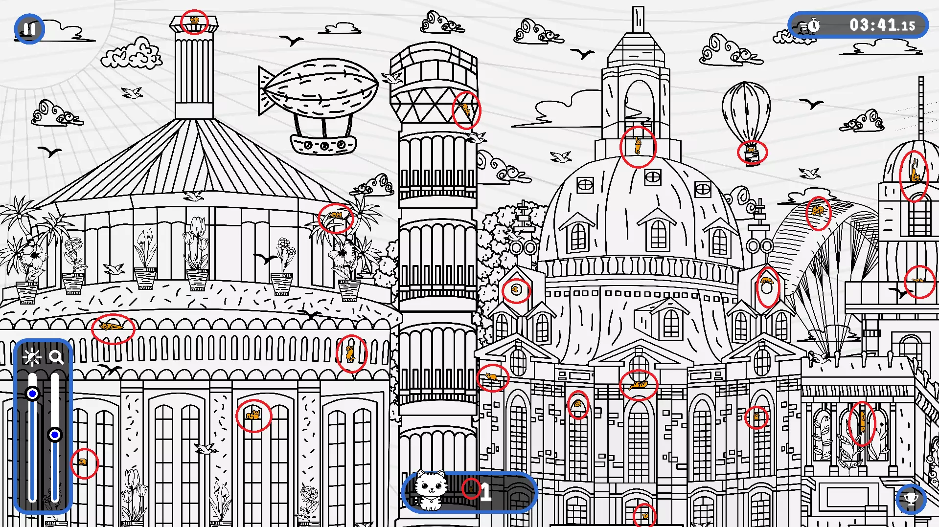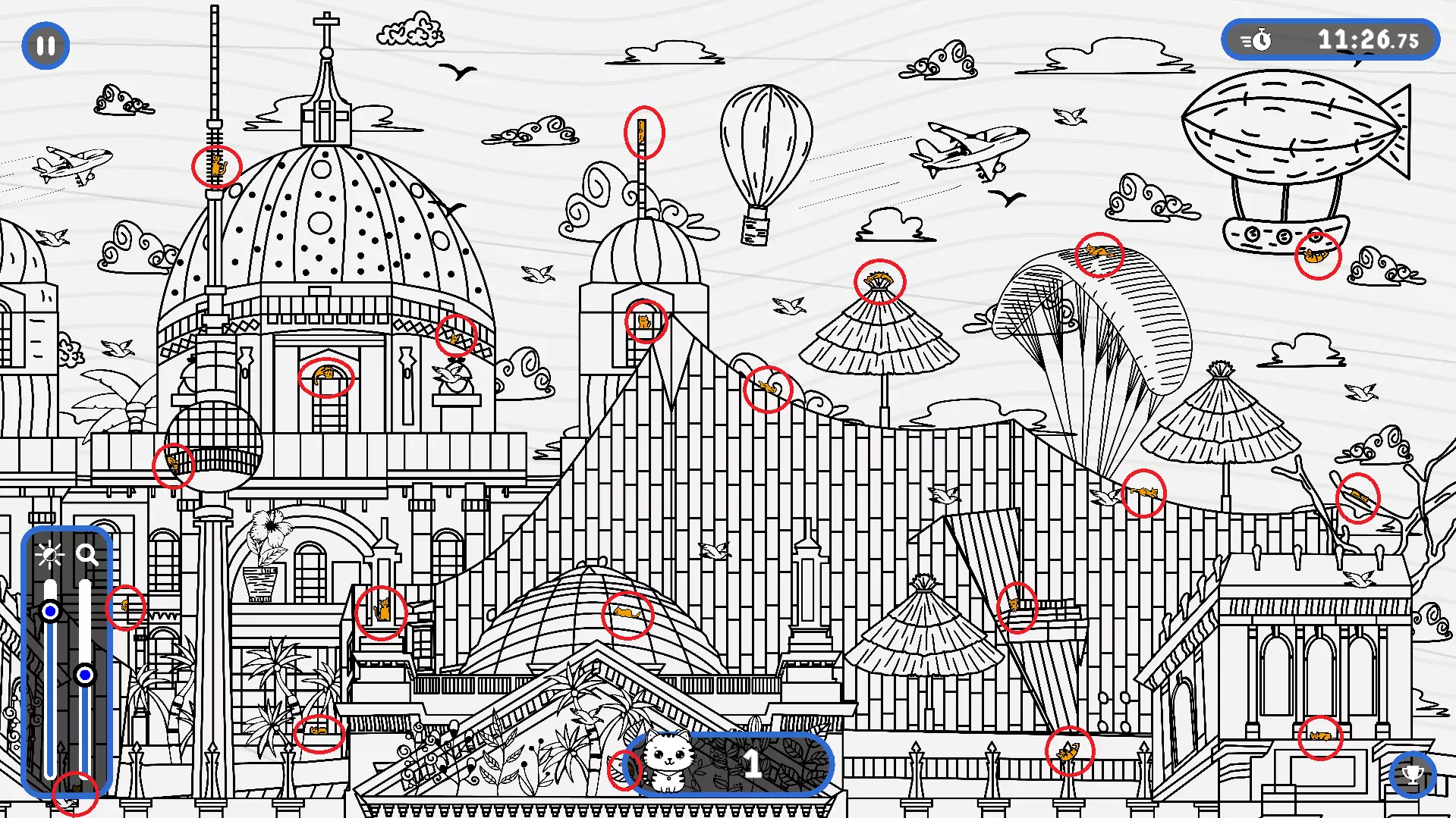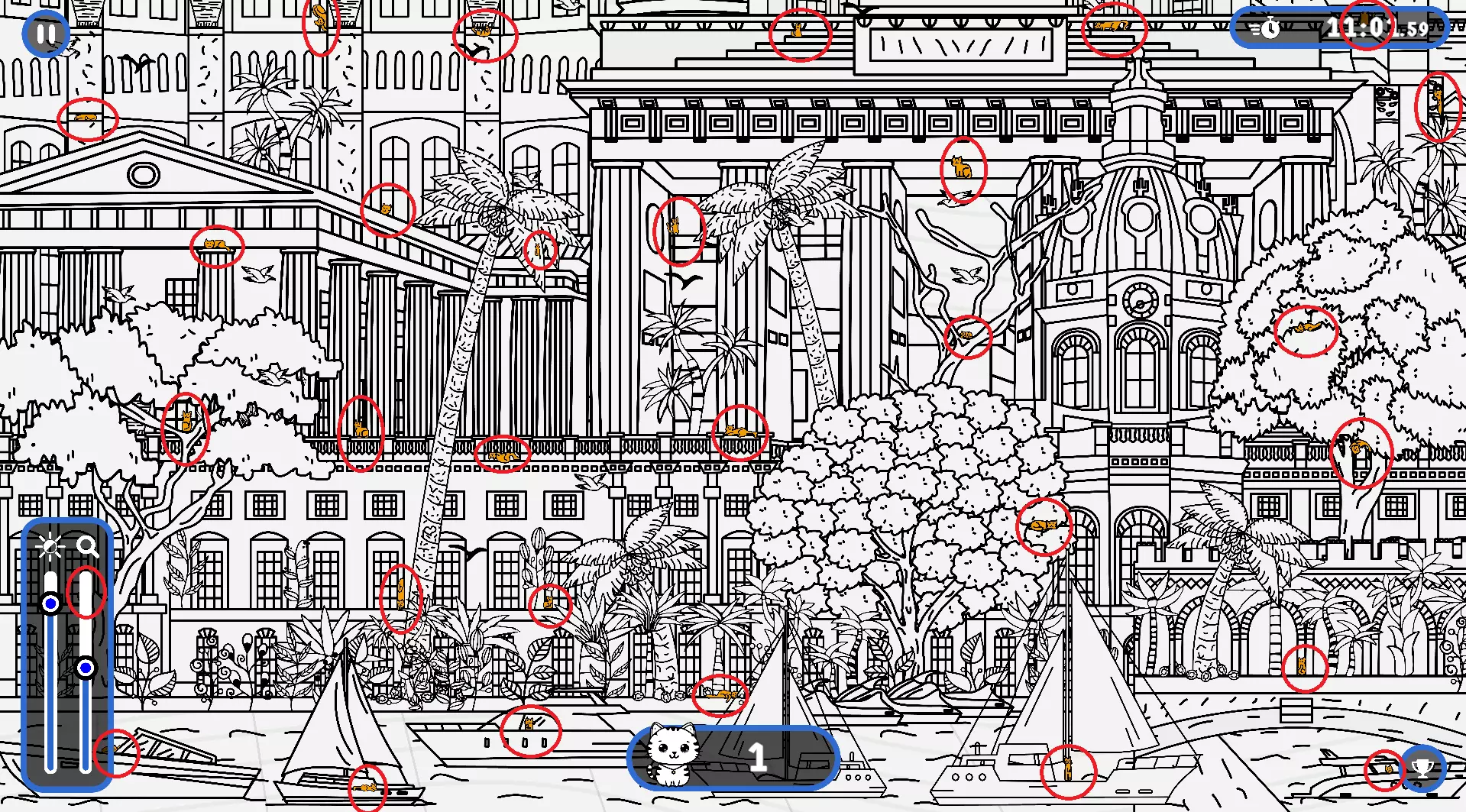 2) 请注意,有些猫咪隐藏在用户界面和计数条后面。这些猫咪也已用圆圈标出。