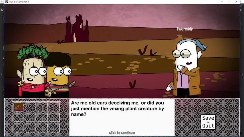 Night of the Shrub Part 3 is a short, visual novel, with a single story line rife with odd happenings – It's the beginning of the end. And then it's the end. But before that, an evolved Robert must get to a world full of vampires to find Lord Stephen and bring him back to take over our world. An evolved Shrub and Rolf must get back to our world, with a strange lady in tow, to resolve the standoff between The Daphne and the ghost aliens. And what secret are Doctor Ow and the Margrave hiding? We've evolved beyond elevators here; it's all portals, portals, portals in this thrilling conclusion to the Night of the Shrub Trilogy. No pesky choices to make. Endearing characters click after click. Fantastic sound track. Fun for the whole family.