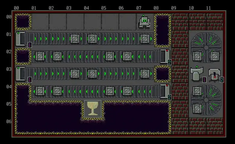 A tile-based puzzle game with a twist: you can't control your robot directly, you must program it with a crude and cruelly limited programming language. Build your programs out of a custom language created for this game, navigate obstacles, obtain trophies, and keep your robots from falling into pits. Add words to your program by pressing the editor with the mouse. Click the EXECUTE button when you are ready to see the results. The robot will do EXACTLY what you instruct it to do, for good or for