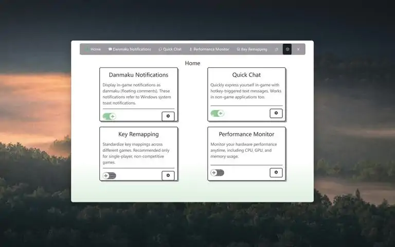 这是一款游戏辅助工具,它的功能有:1、弹幕通知 在你全屏打游戏的时候,能够及时的提醒你windows的通知,windows的通知将以弹幕的形式在您的屏幕上飘过。2、性能监控 在你打游戏的时候,能够观察电脑硬件的状态。3、快捷喊话 你可以设置一些快捷短语,快速的在游戏中交流。4、改键(测试了一些游戏,有些可以,有些不可以,软件的方案有时候会被识别成外挂) 你可以修改按键的设置,能够实现不同的游戏使用同一套键位。