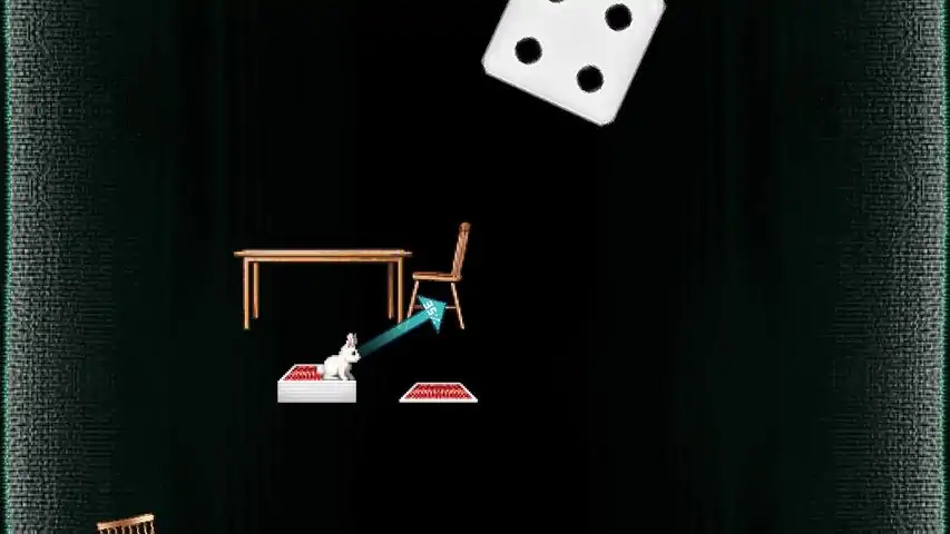 A magician has stored a rabbit in his enchanted top hat. Inside the hat is a pocket dimension, seemingly as big as a tower, which he uses to store his stage props and more. But the rabbit can smell a bag of carrots outside... help the rabbit hop out, for freedom and carrots! Use your mouse to determine the rabbit's jump angle and strength: it's simple to learn, difficult to master. Hopping Up for It is a type of game that may be familiar to some: You only go up, while getting over obstacles until you reach the top. But this game would be nearly impossible for most players if not for its ability to save and load any time (and even then, it's quite the challenge)! Only a true king or queen of jumping may ever make it out without using saves-- though the game will recognize it if you do. There will be obstacles and tricky platforms such as giant dice, bouncy balloons, sliding cards, flipping coins, teleporting wands, swinging pendants and more. Can you escape the hat?