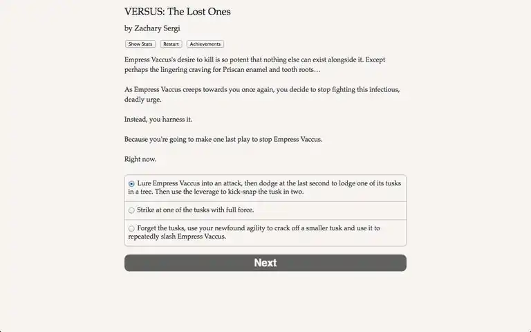 Steal alien powers and absorb their memories! Can you outlast your opponents to escape from planet Versus?Versus: The Lost Ones is a thrilling 123,000-word interactive novel by Zachary Sergi, author of our best-selling Heroes Rise trilogy. Your choices control the story. It's entirely text-based--without graphics or sound effects--and fueled by the vast, unstoppable power of your