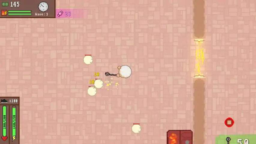 Survive as long as possible in Fried Panic! Buy weapons, abilities, and even donut producing machines. Fight through waves of eggs, lemons, chicken drumsticks, and much more, all in a top down pixel art