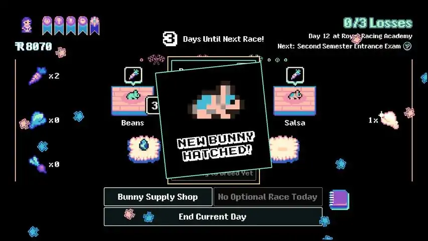 Dive into a roguelike management sim where your career as a racing bunny stable manager may be as fast and short as a bunny's quick lifespan. Reach the Diamond Dutch Ultimatum Race before you accumulate three losses!With unique Natures that impact racing and feeding strategy, each bunny you buy as an egg and hatch will contribute to your roster in a unique way. With only a brief period of time before your bunnies are too old to race and retire, you have to budget carefully for different types of food that will raise one of a bunny's three stats. Do you focus on stamina so they can sprint for longer, or go all in on speed - or do you give them more chutzpah, allowing for a bigger boost to their speed when they sprint? Will you go for a balanced approach, or a targeted one?It's up to you to direct your bunny's energy once they hit the track, knowing when to sprint, when to reserve their stamina, and when to go for broke and risk using all their stamina knowing that they'll pass out shortly after you empty their stamina bar! Once your bunnies are old enough, breed them together to combine their stats resulting in super-speedy multicolored offspring. Watch your bunnies' lineage grow and become more and more colorful as you add more bunnies (and their juicy stats!) to the