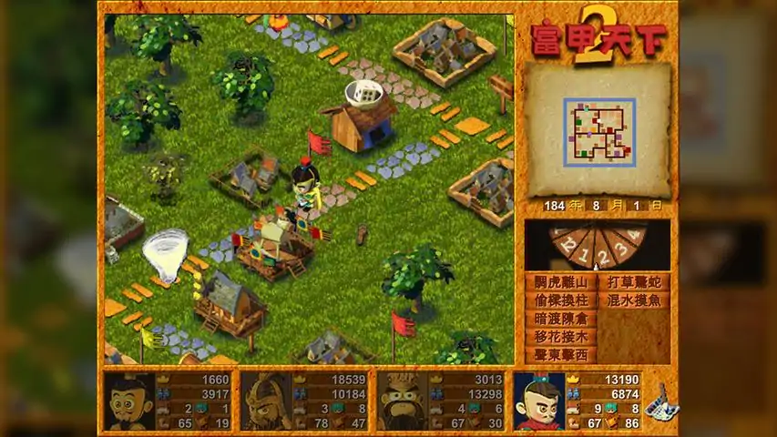 经典三国大富翁游戏,老玩家回味纪念版。 有四位主公可供选择,分别是刘备、曹操、孙权及董卓。这四个角色各自拥有不同的属性,最多可采四人同玩,谁先占领所有的城池便可一统天下。可选的战斗模式仍是富甲天下系列经典的「单挑」、「野战」及「攻城」。城池经营增加了「建物」设计,如「市集」可提高税金收入、「护城河」可以增加城池的防御力、「粮仓」可加快人口成长、「练兵场」可训练士兵,「兵营」可进行征兵,「书院」可增加驻城武将的智力。游戏中有许多有趣的计谋,像是使敌方主公原地停留一次的「故步自封」、引诱对手走到您指定的地方的「调虎离山」、破坏敌方城中的一项建设的「过河拆桥」、将对手的武将挖角过来的「欲擒故纵」等,这些计谋可在锦囊铺中买到或由随机事件获得。新增的有趣及特殊的场景包括了赌场、聚贤庄、医馆等。如果爱将的智商不够,还可以到经阁买经书以增加智力。