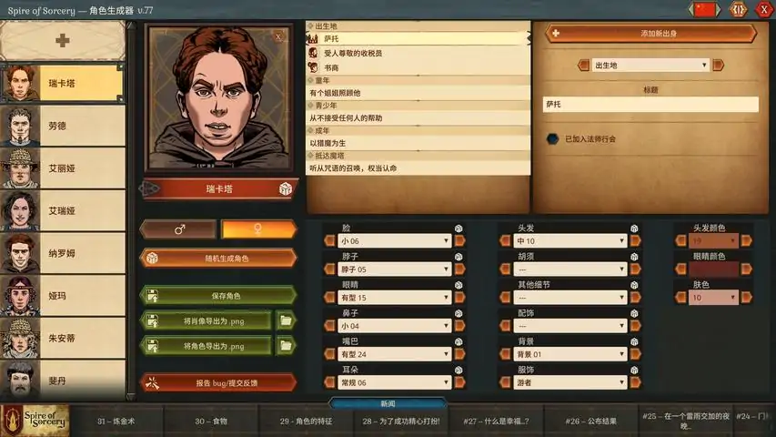 Spire of Sorcery 是一款发生在未来开放世界的生存角色扮演游戏,由 Alexey Bokulev(Spire of Sorcery - 角色生成器是一款免费配套工具,使你能够体验趣味和发挥创造力:在伦德世界随机生成角色(传记和肖像),还可以根据你的喜好编辑!创建自己专属的角色:创作背景故事、起名 - 然后组合相匹配的肖像!与社区分享作品:将肖像导出可用作头像;将肖像和传记导出可在 Discord 和任何其他平台分享!随着我们在制作主游戏方面取得了进展,产品的更新中包含了新资源。 我们乐于接收反馈意见,也十分欢迎大家在 Steam 和 Discord 提出建议和 bug 报告!十分感谢你帮助我们为大家创作更优越的游戏体验!