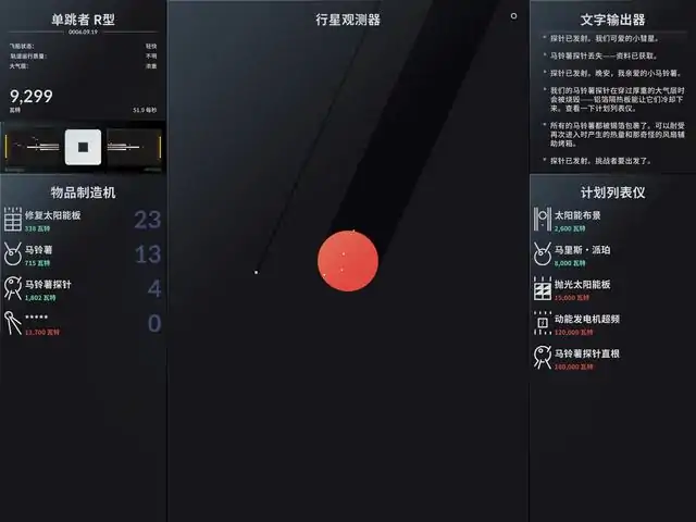 太空计划是基于部分误解了史蒂芬·霍金『时间简史』的一个实验性互动游戏。你身处于一个不起眼的卫星上,绕着一个神秘星球的轨道上运行。你手动点击,伴随着时间的流逝,创造和发射各种基于土豆的设备与探针。请来解开星系的奥秘吧!或者就在这个备受天文物理学界赞美的『有史以来最佳叙事型科幻点击游戏』中来打发时间吧!特点需解锁、创造总共十五种的淀粉类物品,然后把它们发射到宇宙的真空中。本游戏搞笑的故事,将帮你重新领悟生命的价值,并顺便消磨你的时间。为你展示横跨两种不同现实、五种不同行星的奥秘。依照叙事型科幻点击游戏的惯例,本游戏有很“燃”的配乐